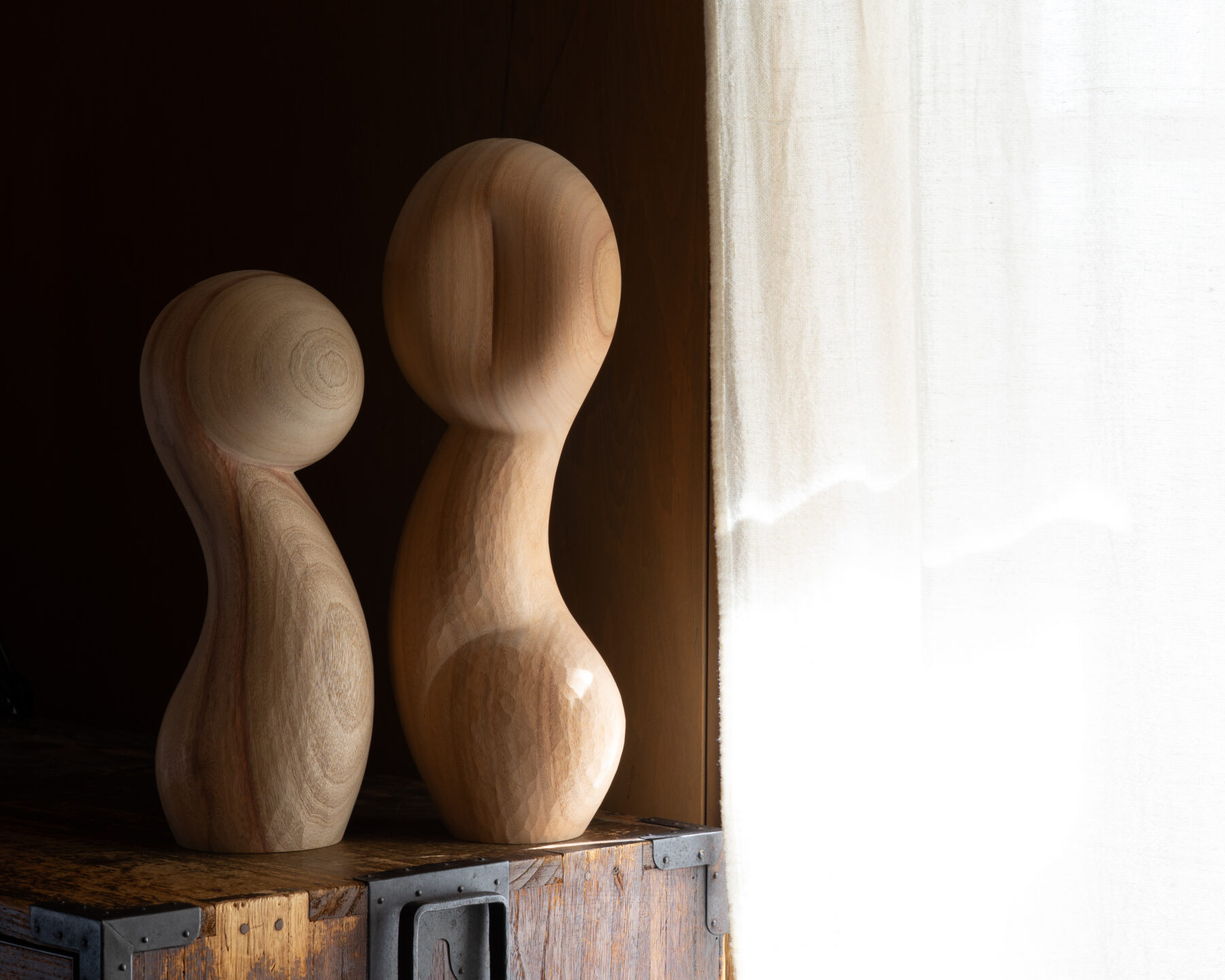素材にはウォールナットやメープル、チェリーなどの広葉樹が用いられ、木が本来持つ色や木目、質感を活かしながら一点一点手作業で削り出されます。削りの痕跡を残す有機的なフォルムと、磁力によって成立する構造が組み合わさることで、静かなバランスの上に成り立つ造形が立ち上がります。